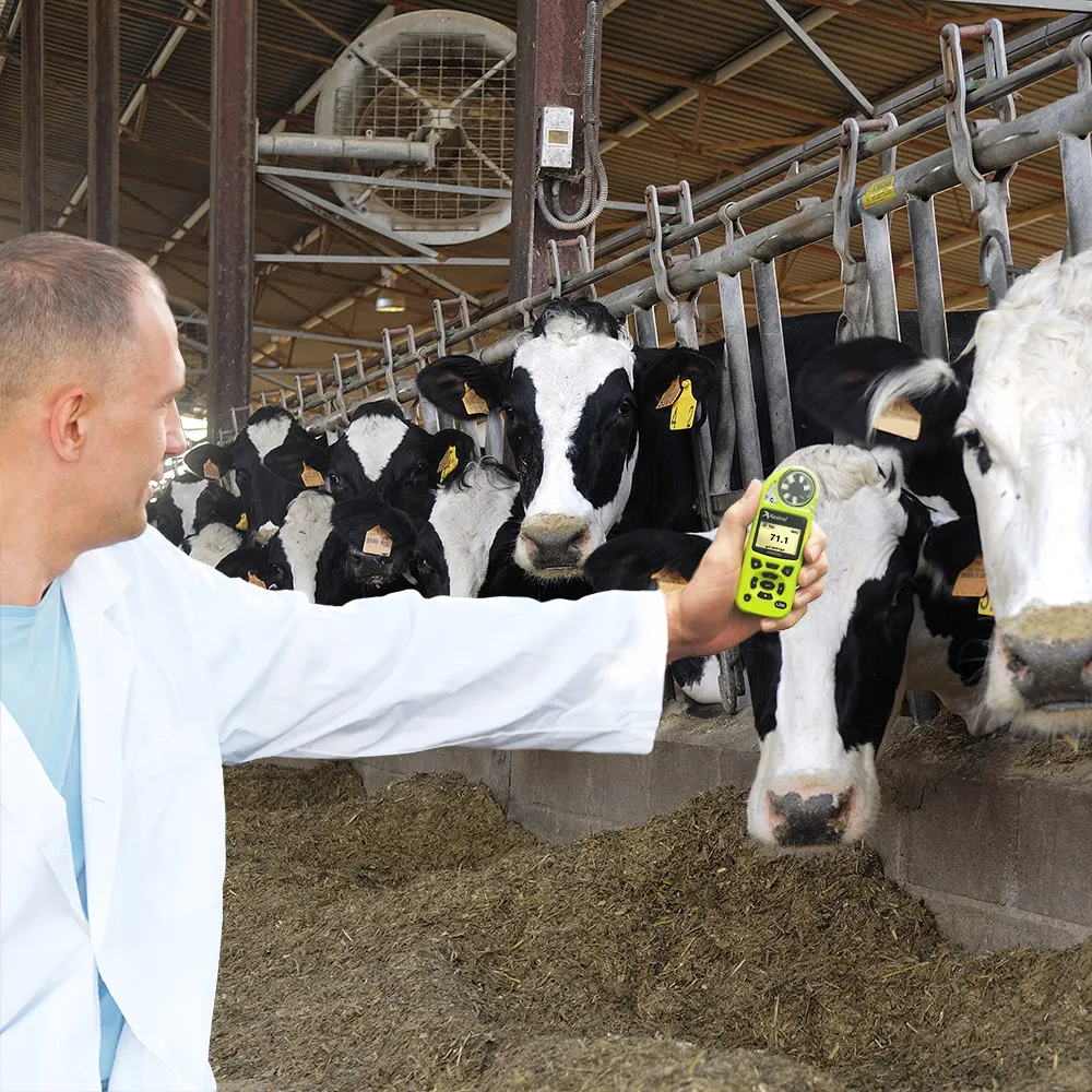 El THI (Índice de Temperatura-Humedad) se ha utilizado durante décadas como medida para clasificar el riesgo de estrés térmico en muchas operaciones de producción y transporte ganadero. Esta medición incluye tanto la temperatura como la humedad relativa y sirve de base para prácticas de manejo estratégicas y tácticas que benefician la salud, la productividad y el bienestar animal. El Kestrel 5500AG calcula y registra el THI in situ basándose en la selección del usuario de los cálculos de THI aceptados por el NRC (Consejo Nacional de Investigación, 1971) o Yousef (Yousef, 1985). Las mediciones objetivas y precisas, específicas del sitio, son fundamentales para garantizar una estrategia de manejo del estrés térmico rentable; y están a su alcance con el 5500AG.