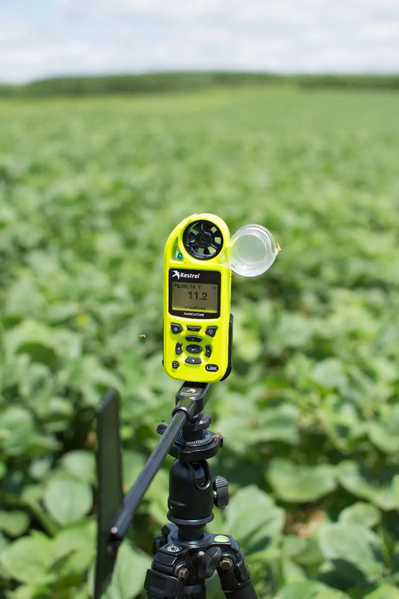 El Kestrel 5500AG proporciona mediciones Delta T para ayudar a evaluar las condiciones de pulverización aceptables y garantizar que se ajuste a las directrices. Basándose en la temperatura ambiente y el punto de rocío, el Delta T proporciona una guía sobre la tasa de evaporación de los productos químicos pulverizados para ayudarle a seleccionar la boquilla de pulverización adecuada. La brújula proporciona la dirección para minimizar la deriva de la pulverización. El Kestrel 5500AG calcula y registra el Delta T, la velocidad y la dirección del viento in situ sin necesidad de intervención del usuario. Al combinarlo con las mediciones de viento promedio y ráfagas máximas del Kestrel, los profesionales agrícolas pueden garantizar una pulverización segura en todo momento. Utilice una bolsa de transporte para accesorios para tener su Kestrel a mano en el cinturón, listo para usar antes de cualquier pulverización.