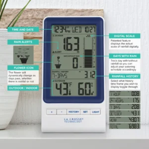 Con Pluviómetro Digital 724-1415BL y Sensor de Temperatura, deje de adivinar el clima y tome el control de su entorno. Este sistema integral está diseñado para ofrecerle una visión detallada y precisa de las condiciones ambientales tanto dentro como fuera de su casa, convirtiéndose en la herramienta definitiva para su hogar y jardín y entender su entorno como nunca antes.